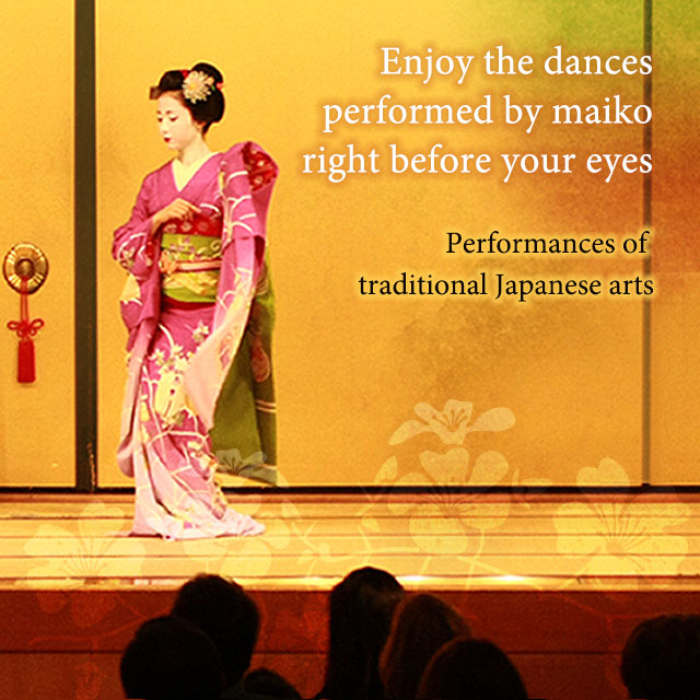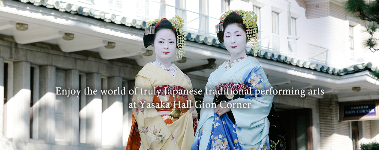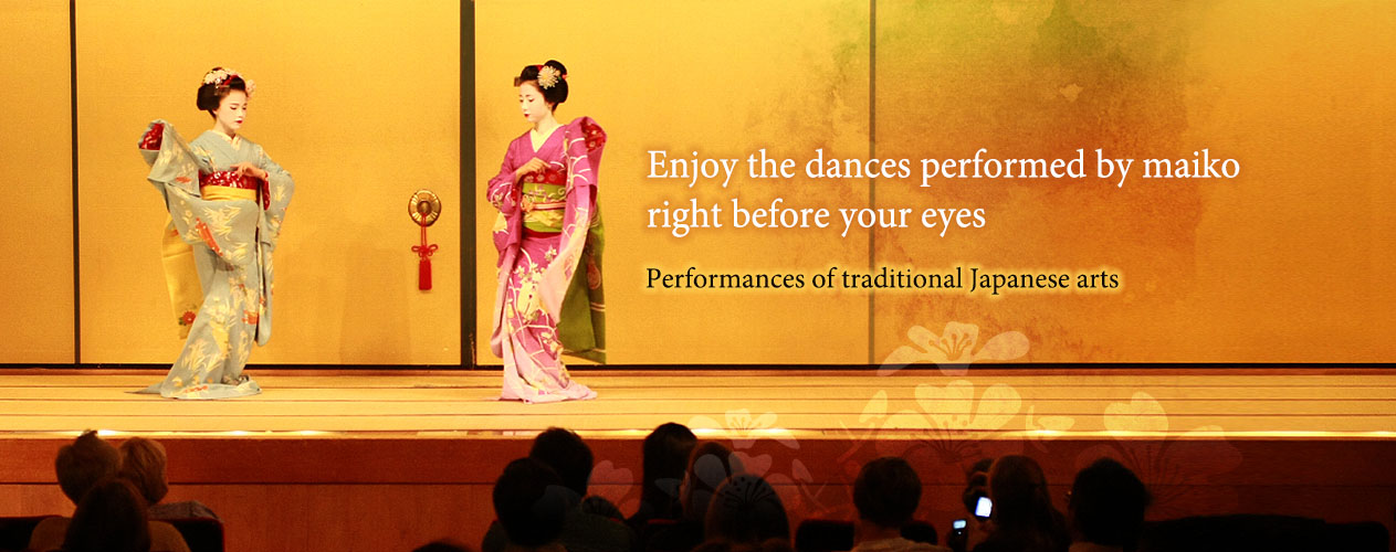 The theater is located in Gion Kobu, the largest of the five traditional kagai entertainment districts of Kyoto. The Kyomai dance part of the program is particularly representative of the Gion area and is performed by maiko, apprentices studying to become geiko. Known as geisha in other regions, geiko are traditional female performing artists who entertain guests with dances, songs, music, and games.